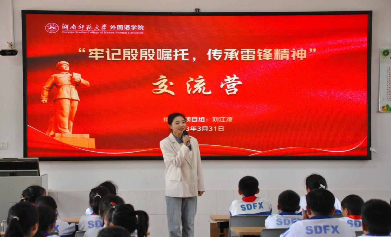 挑战杯项目团队成员刘江凌向师大附小的同学们讲述了雷锋热心助人的故事,通过与学生的互动,阐明了传承雷锋精神的重要性。她介绍了团队成员为传承雷锋精神所做的相关工作,呼吁更多的同学加入到学雷锋的活动中,让学雷锋活动融入日常、化作经常,做雷锋精神国际传播的种子。
