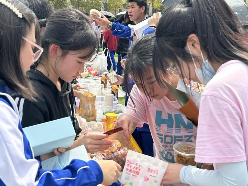 活动前期,为保证义卖活动顺利开展,各班提前做好海报设计、人员安排、物品存放等准备工作。在班主任的引导下,各年级各班分批有序进入田径场,在场上设置摊位、摆放物品。义卖商品皆由师生自愿提供、自主定价,其中以小吃、书籍、手工艺品居多。此外,还有套娃、盲盒、随机舞蹈等独具特色的活动。