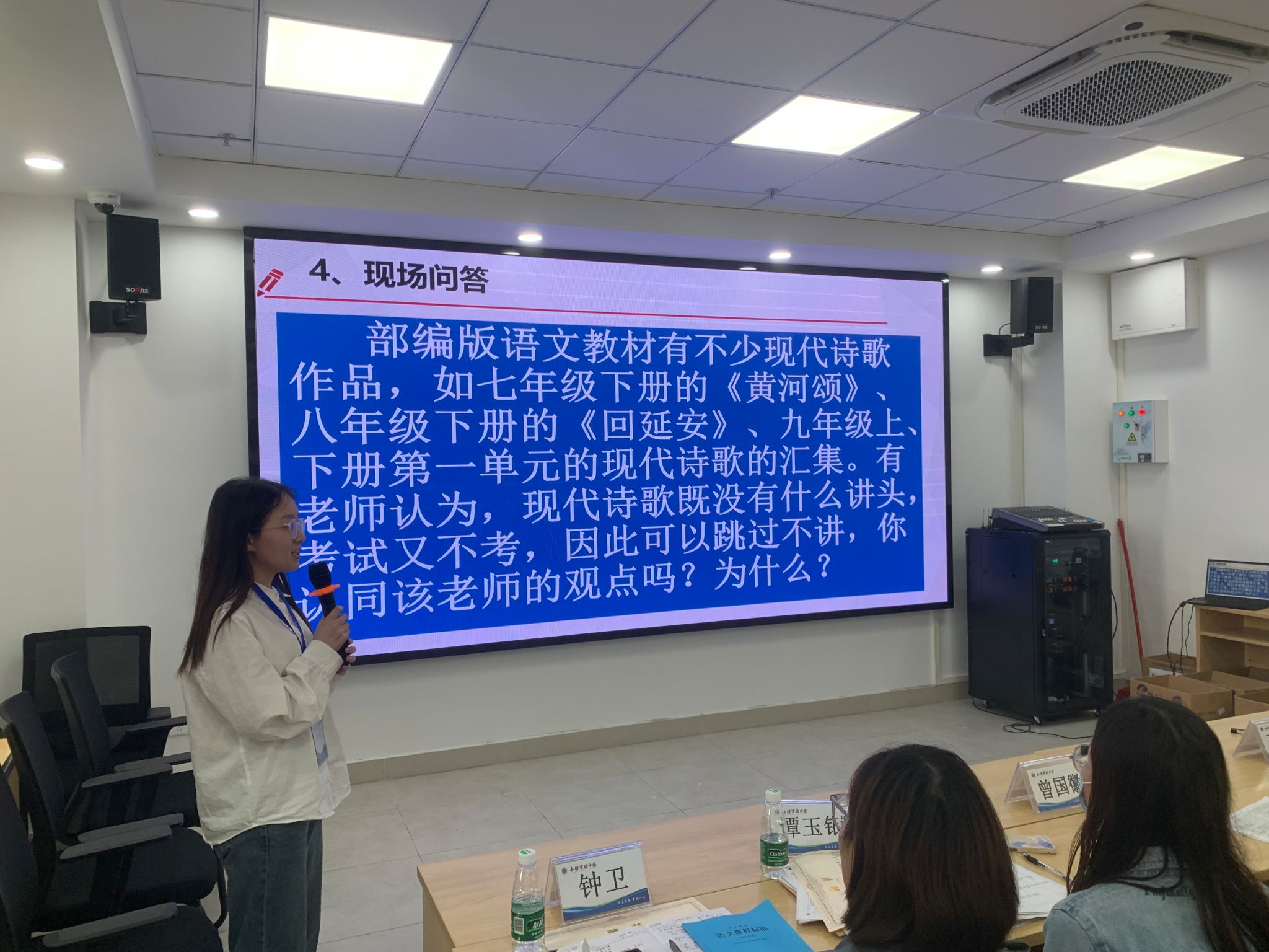 北滘中学专家王丽君讲述自己的教师成长经验,对顺德区青年教师教学能力大赛项目赛制进行解读,从多维视角、追问策略、细读文本三个角度分析文本解读策略,并分享诸多答题技巧。活动现场,杏坛初级实验中学教师钟卫、谭玉银与王丽君进行交流,深入研读部编版初中语文教材,实习队队长赵晨西现场回答有关“现代诗歌教学”的考题,获得王丽君的高度评价。王丽君表示:“从问答环节的互动来看,威廉希尔中文网站平台威廉希尔中文网站平台的实习队专业素养扎实、师范技能优秀,队长能力突出,队员态度勤恳,他们的到来为杏坛教育事业注入生机与活力。”