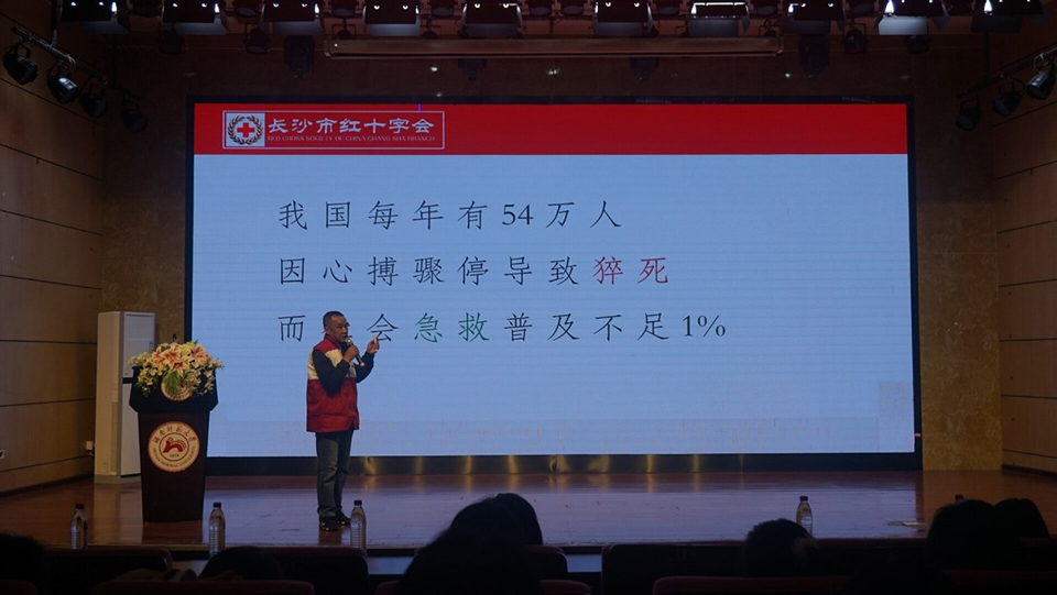 (通讯员 何缨 高陈成 罗娜)为强化校园应急知识教育宣传,提高学生安全意识,4月6日下午,树达学院经管系、理工系于树达楼113报告厅举行以“学急救知识,守生命平安“为主题的急救知识培训会。经管系系主任杨龙和、院团委副书记龙珊、理工系团总支书记朱继来、经管系团总支书记王贞、经管系辅导员刘浩月出席活动。长沙红十字会志愿服务队孙怀东担任此次培训会主讲人。