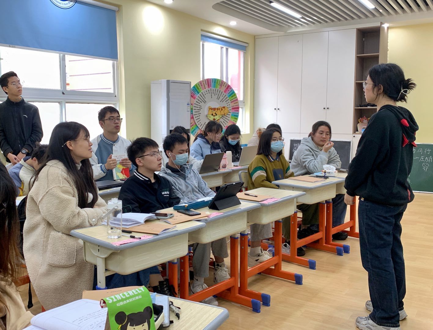 王九九以“与什么同行”为导入,引出“压力”这一课程主题,并通过冥想让学生们回顾最近发生的压力事件,让同学们画出专属于自己的压力圈,去发现压力在自己心中的形象。她利用“情绪猜一猜”游戏,引导学生们探索自己面对压力时的状态和情绪。她抛出“如果压力全部消失”的假设来引起学生对压力的思考,她在课程最后表示:希望2205班的同学在与压力同行的路上能做到与压力和谐相处,并肩而行。