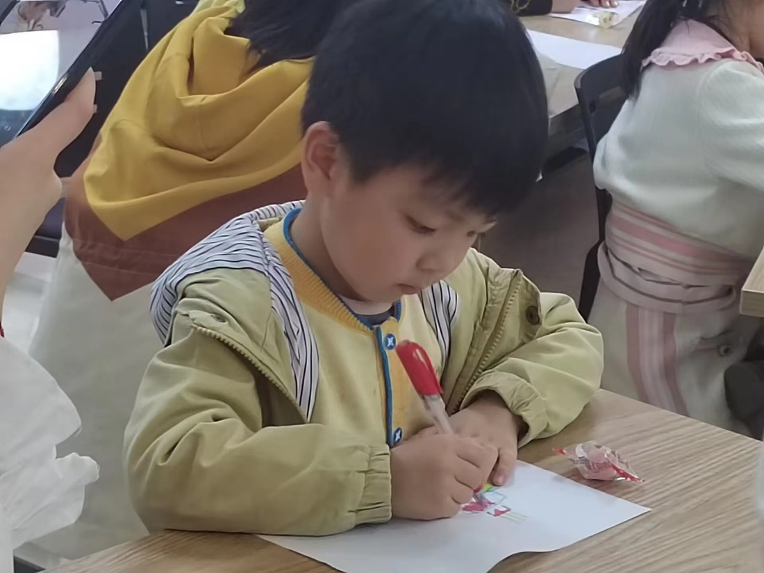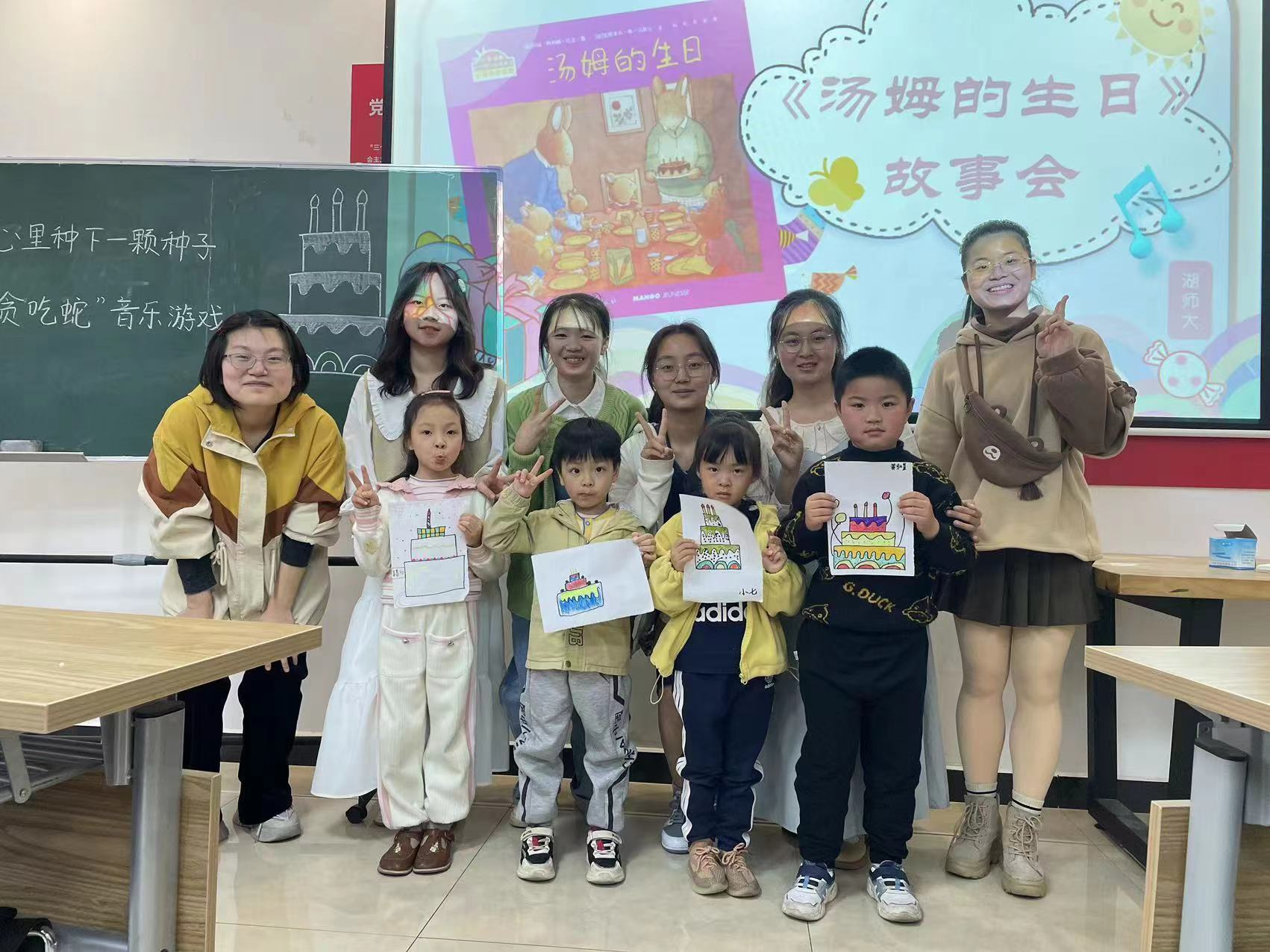 朱宇欣结合绘本内容讲解,引导小朋友们联系日常生活,走出自己的内心世界,懂得与他人分享快乐。邹锋霖带领小朋友们绘画,教导大家用喜欢的形式和色彩,绘制出心目中的生日蛋糕。何文沛给小朋友们播放了儿歌,鼓励孩子们与志愿者一起合唱,小朋友们积极参与。活动最后,志愿者和小朋友们合影留念。