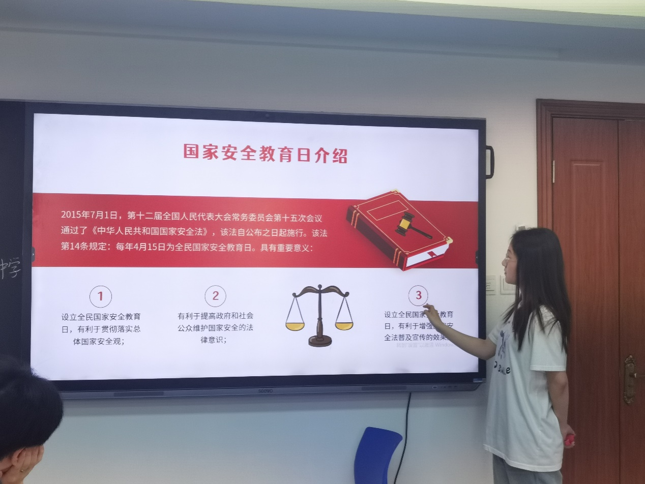队员陈子豪和潘浩宇以情景剧的形式演绎危害国家安全的“策动国家工作人员叛变”行为,并呼吁大家对策动保持警惕,勇敢反驳,坚定维护国家安全。队员唐凤分享自己对于著名间谍川岛芳子在文学作品和历史事件中的认识,并表示:“我们一定要坚定政治立场和政治信仰,把国家安全、人民利益放在第一位,对一切可疑的迹象严加防备,坚决不和‘川岛芳子’们为伍。”赵晨西对危害国家安全和维护国家安全的行为进行总结。