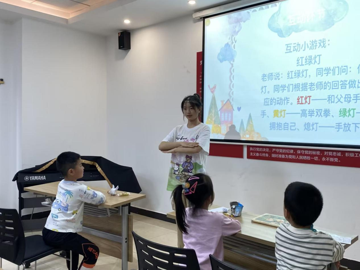 工作人员与志愿者一同前往社区活动中心集合,工作人员介绍了相关设备的使用事项以及在与小朋友互动交流过程中的细节。在简单的培训后,志愿者和参与活动的孩子们一同前往三楼多功能室。