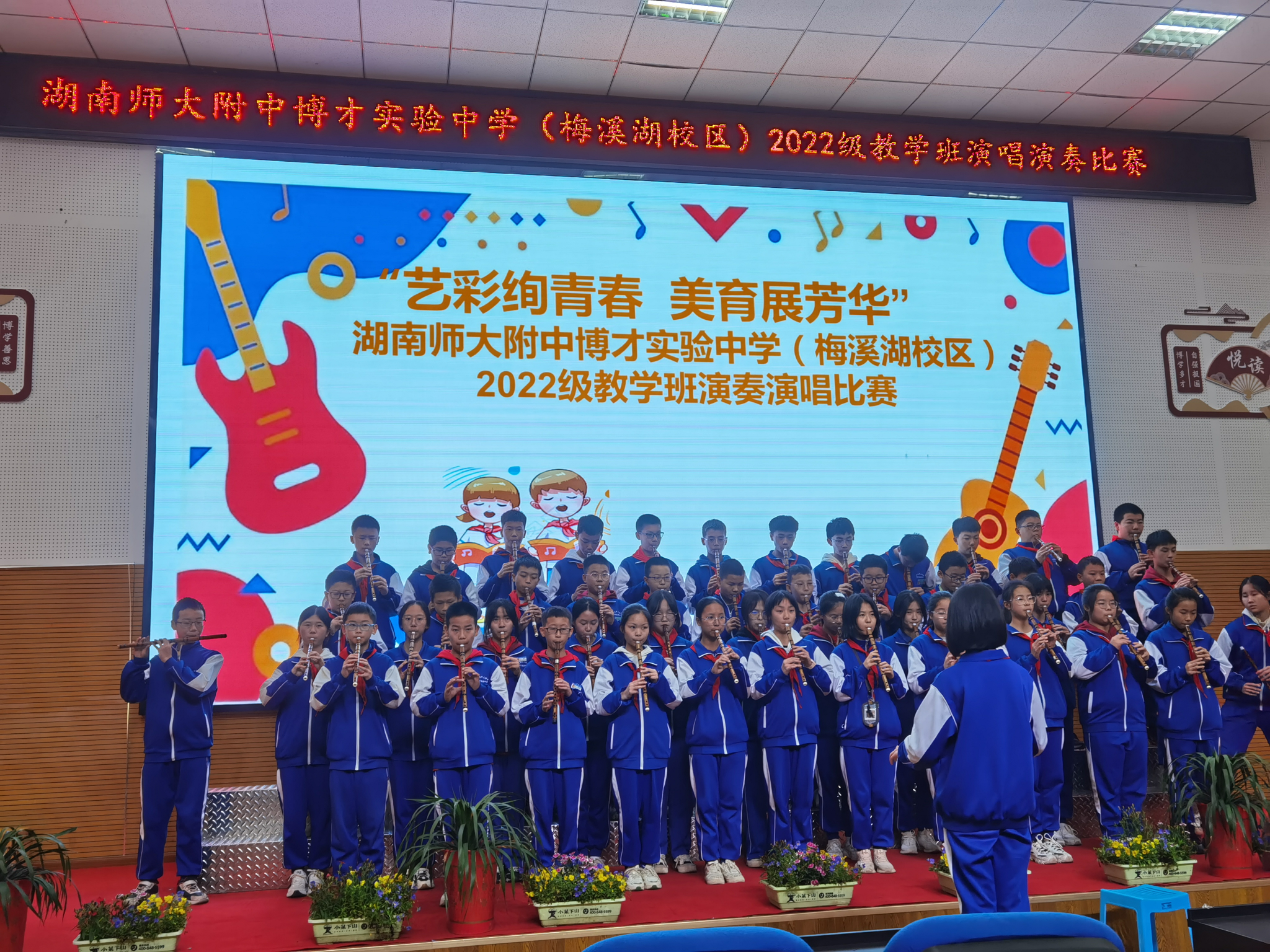 演唱演奏比赛贯彻博才的“幸福教育”理念,即每个学生都能获得音乐的熏陶,拥有丰富的精神生活,实现全面发展。实习队员承担起实习班主任的职责,督促学生穿好配套校服,准备好乐器,有序组织初一年级各班的演唱演奏比赛。比赛进行时,实习队员在各班班主任的指导下,在维护班级候场纪律、组织有序上台、拍摄视频照片留念等环节发挥了实习班主任的作用,切实保障了初一年级各班学生的演唱演奏比赛的顺利开展。在比赛结束后,实习队员提醒各班学生整好队伍,保持安静,有序退场,安静有序地回到各班继续上课。