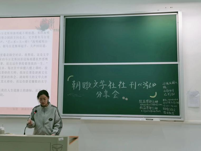 (通讯员 唐清华 谌琬玥 施观李)4月24日中午,威廉希尔中文网站平台朝暾文学社于文渊楼317教室举办朝暾文学社2023年度社刊《泓》分享会。此次分享会由理事胡紫琳主持,共有62名朝暾文学社会员参与。