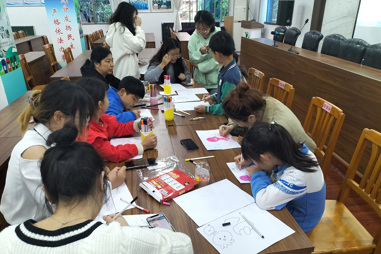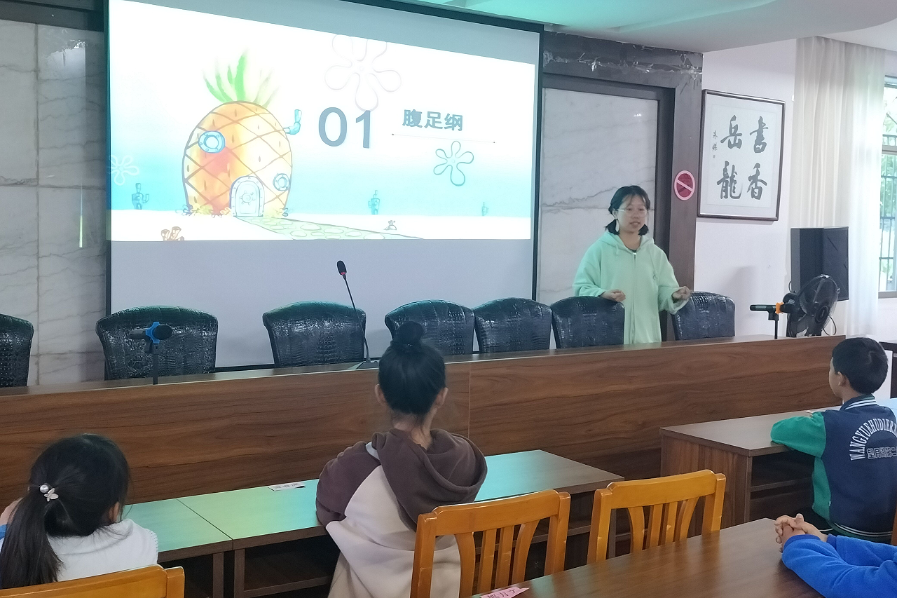 此次活动分为知识讲解和创意绘画两部分。彭雅智通过文字与图片相结合的方式,向小朋友们讲解了软体动物的相关科学知识,并与小朋友交流互动。志愿者们为小朋友分发纸张、彩笔等绘画工具,并协助小朋友绘制软体动物的简笔画。小朋友们选择想要绘画的动物,在志愿者的提示下绘出动物的外形特征并涂上颜色。活动结束后,志愿者们与小朋友们合影留念。