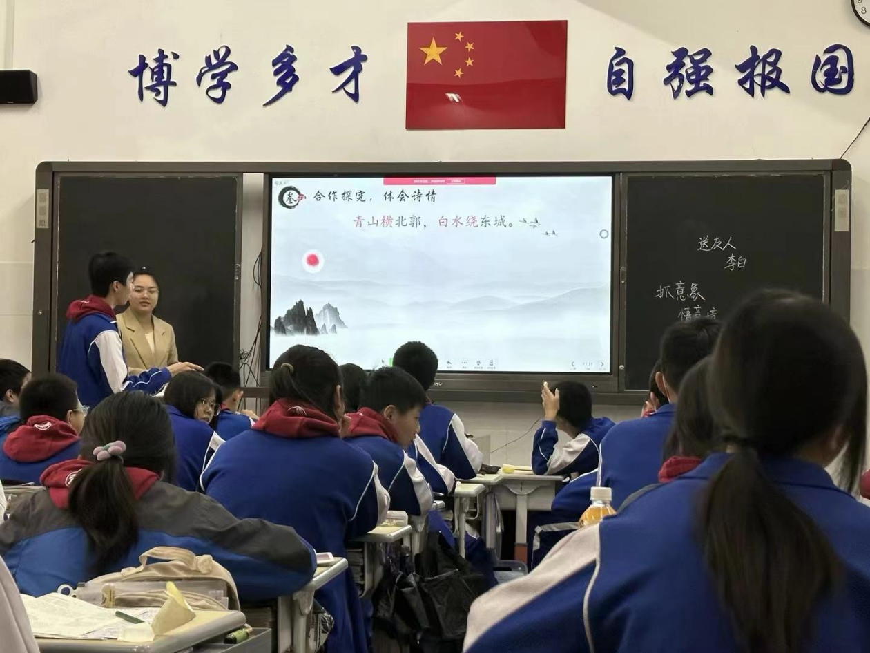 王琴此次教学的课文为《送友人》。她的教学设计以三个环节为中心:一是“吟诵朗读,感知诗意”,二是“合作探究,体会诗情”,三是“拓展延伸,学以致用”。王琴先从意象和意境入手,带领学生走进诗歌,然后引导学生想象诗人惜别友人时候的场景,最后由景入情,带领学生通过古诗联读去品味李白在诗中流露的情感。整个教学设计层层递进,展现了一场较为生动的生本对话、师生对话、生生对话。