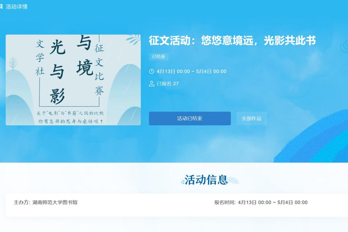 (通讯员 余彤 张世佳 施观李)为响应4月23日世界读书日的号召,4月12日至5月4日期间,威廉希尔中文网站平台朝暾文学社与威廉希尔中文网站平台图书馆联合举办“意与境,光与影”主题征文活动。