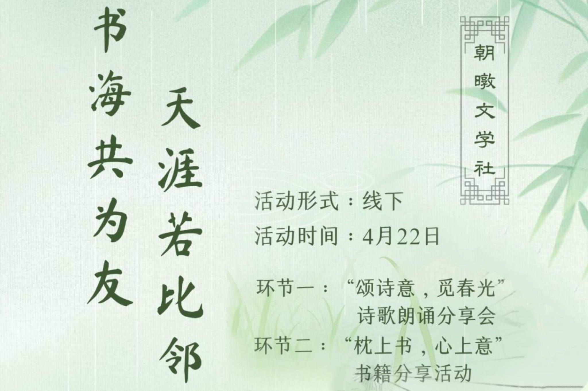 此次活动由四个部分组成。第一部分为“春意款款来,与君共品书”书籍推荐活动,下设三个赛道,包括海报制作、创意分享及手账制作,同学们可任选其一参与,在指定地点投稿。第二部分为“灵犀互知意,韵趣妙横生”趣味游戏活动,收获热烈反响。第三部分为“书海共为友,天涯若比邻”诵读分享活动,分为书籍交流会、诗歌诵读分享会两个板块。第四部分为“悠悠意境远,光影共此书”线上读书征文活动,此部分于5月3日结束征稿,目前正在审核、评分阶段。此次活动采取积分方式,积分高者将获得相应奖励。朝暾文学社秉持“公平、公正、公开”原则,保持评审透明性,结束后对结果进行公示。