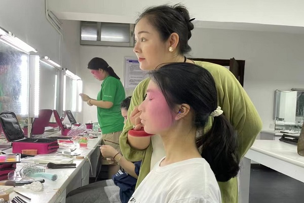 底妆讲解结束后,老师继续讲解眼妆。眼妆分为四步展开,分别是利用调制的玫红油彩进行打底、眼影晕染、眼线勾勒及粘贴假睫毛。眼妆是戏曲妆的灵魂,演员通过眼睛向观众传达情感,一个好的眼妆能帮助演员达到更好的情感表达效果。