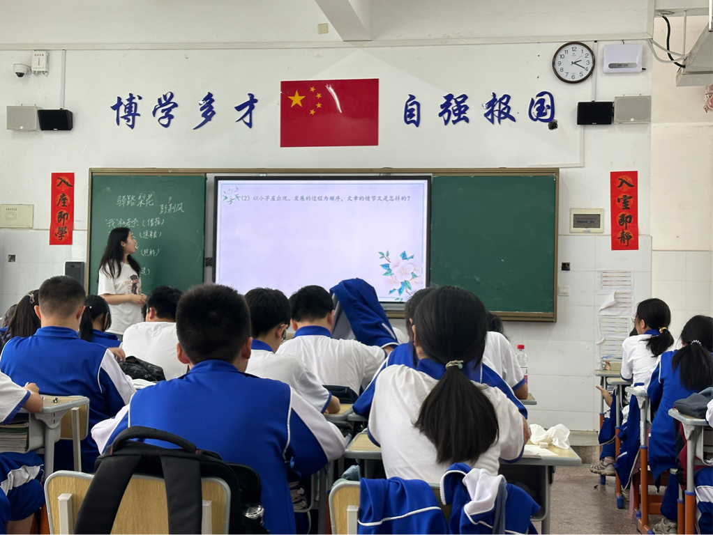 杨嘉荟首先以陆游的古诗导入课文,吸引学生注意力,再依次介绍作者及创作背景。她聚焦于小说的结构、人物、语言、意义分析,引导学生在朗读中体会文本,感受雷锋精神与质朴的民风民情。队员们对杨嘉荟的课堂进行了简要点评。副队长李明霞指出,杨嘉荟的课程内容丰富,层层递进,同时运用表格的方式来明晰课文内容的内在逻辑,提高了课堂的效率,充分尊重学情,问题设置合理,善于引导学生深入理解文本、掌握阅读方法。队长邓睿指出,杨嘉荟教态自然,整节课流畅完整,对回答问题的学生及时给予引导与肯定,整体来说是一节良好的新授课。