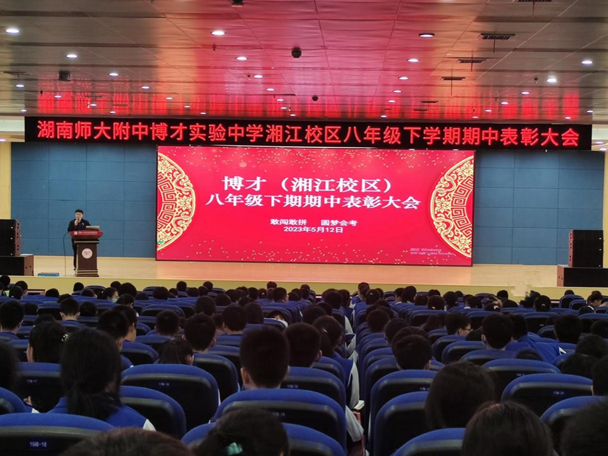 (通讯员 帅吴悠 李明霞)5月12日下午,湖南师大附中博才实验中学(湘江校区)八年级下学期期中表彰大会暨半期总结大会于多功能报告厅召开。此次大会由八年级组组长何义华主持,教务主任张奔胜出席,各实习班主任及初二全体同学到场。