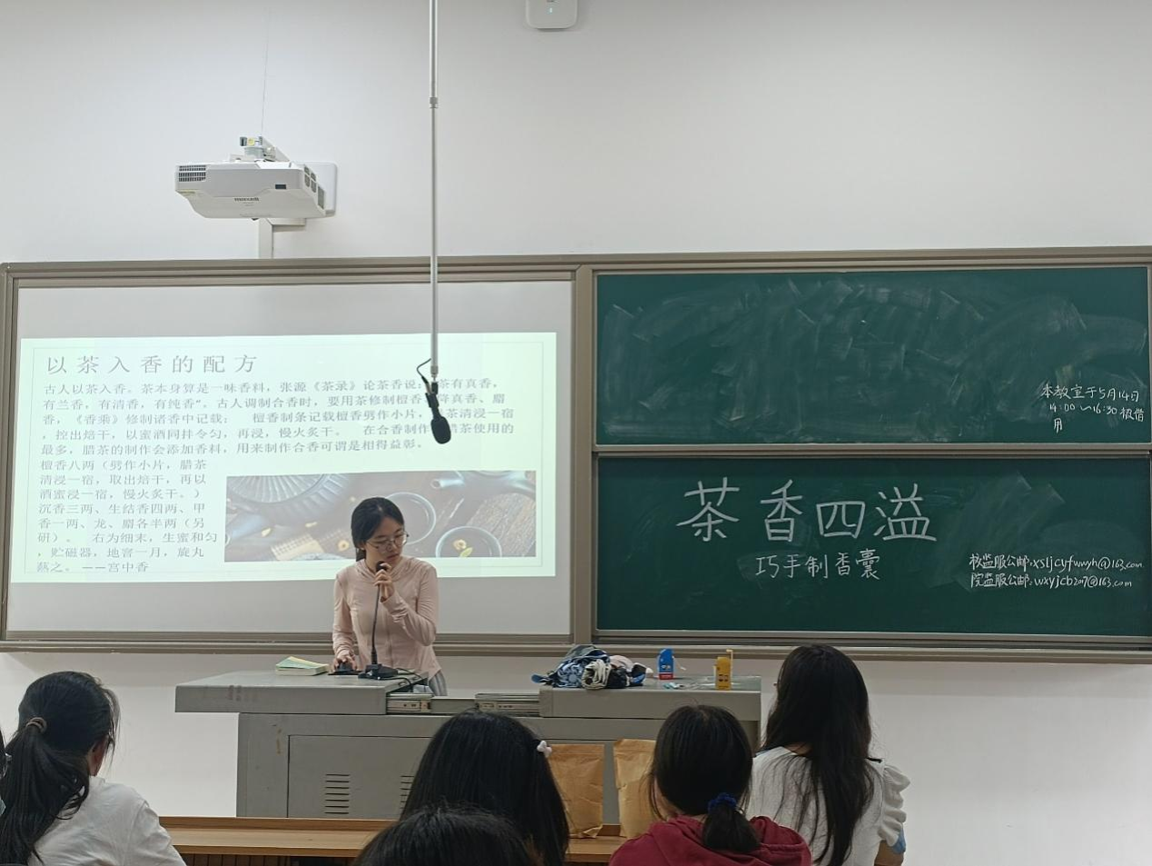(通讯员 黄冰艳 李冰艳 杨思茹)轻嗅一抹茶香,感受茶之芬芳。5月15日中午,威廉希尔中文网站平台鹿鸣茶艺社于威廉希尔中文网站平台416教室举办了“茶香四溢——巧手做香囊”主题活动。此次活动由鹿鸣茶艺社理事长彭夕函主持,理事吴峰玲、黄冰艳协助开展,鹿鸣茶艺社部分会员报名参加。