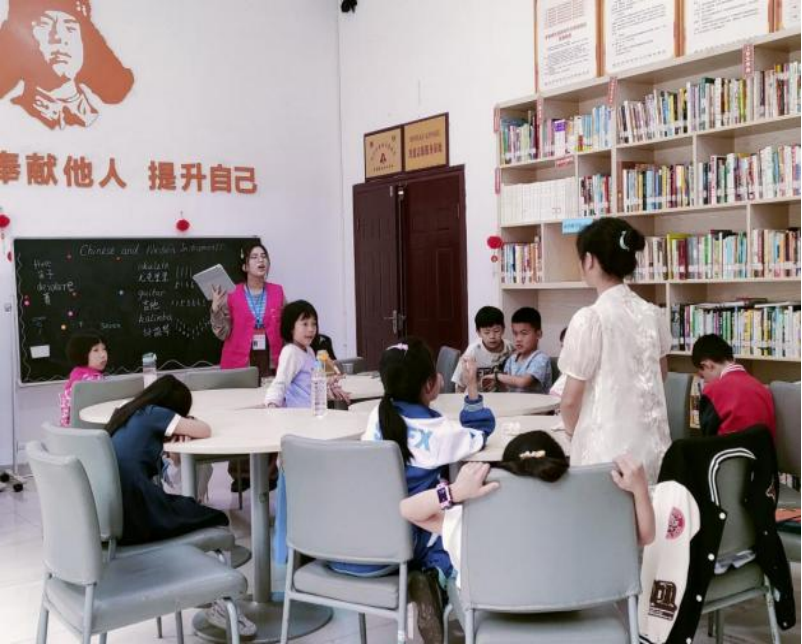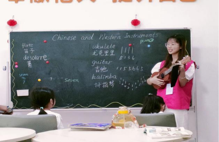 在课堂总结环节,志愿者们阐述了中西方不同乐器背后的文化背景,不仅让小朋友们对中西方乐器的文化内涵有了进一步的理解,也引导其感受音乐跨越时空和国别的魅力。课后,志愿者们耐心指导小朋友们乐器的弹奏技巧,激发了小朋友们学习乐器的兴趣和热情。