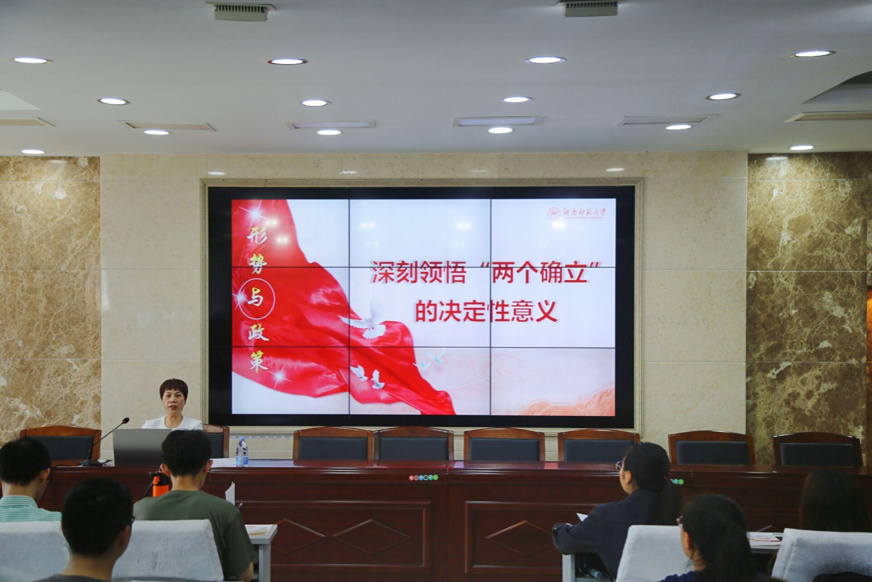 (通讯员 冯意萍 李俊贤)5月18日下午,物理与电子科学学院党委书记罗嵘于格物楼509教室为2022级学生讲授《形势与政策》课程,课程主题为“深刻领悟‘两个确立’的决定性意义”,2022级辅导员蒋文卓担任主持人。