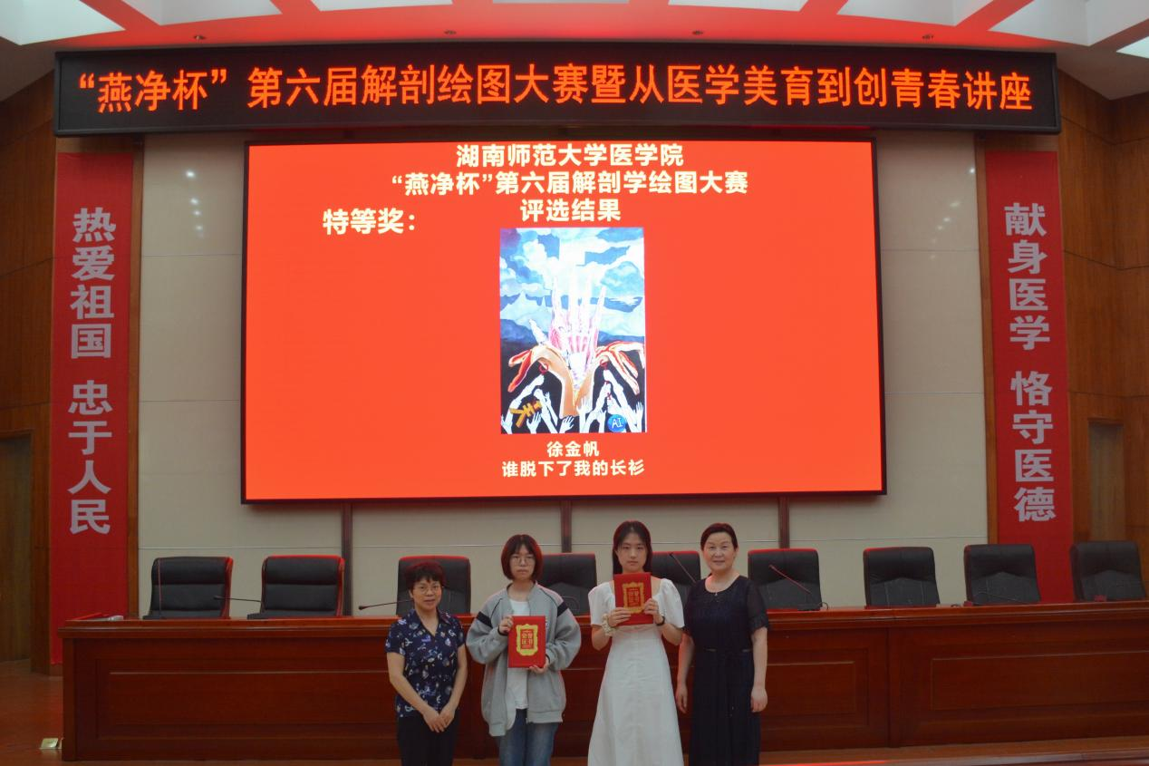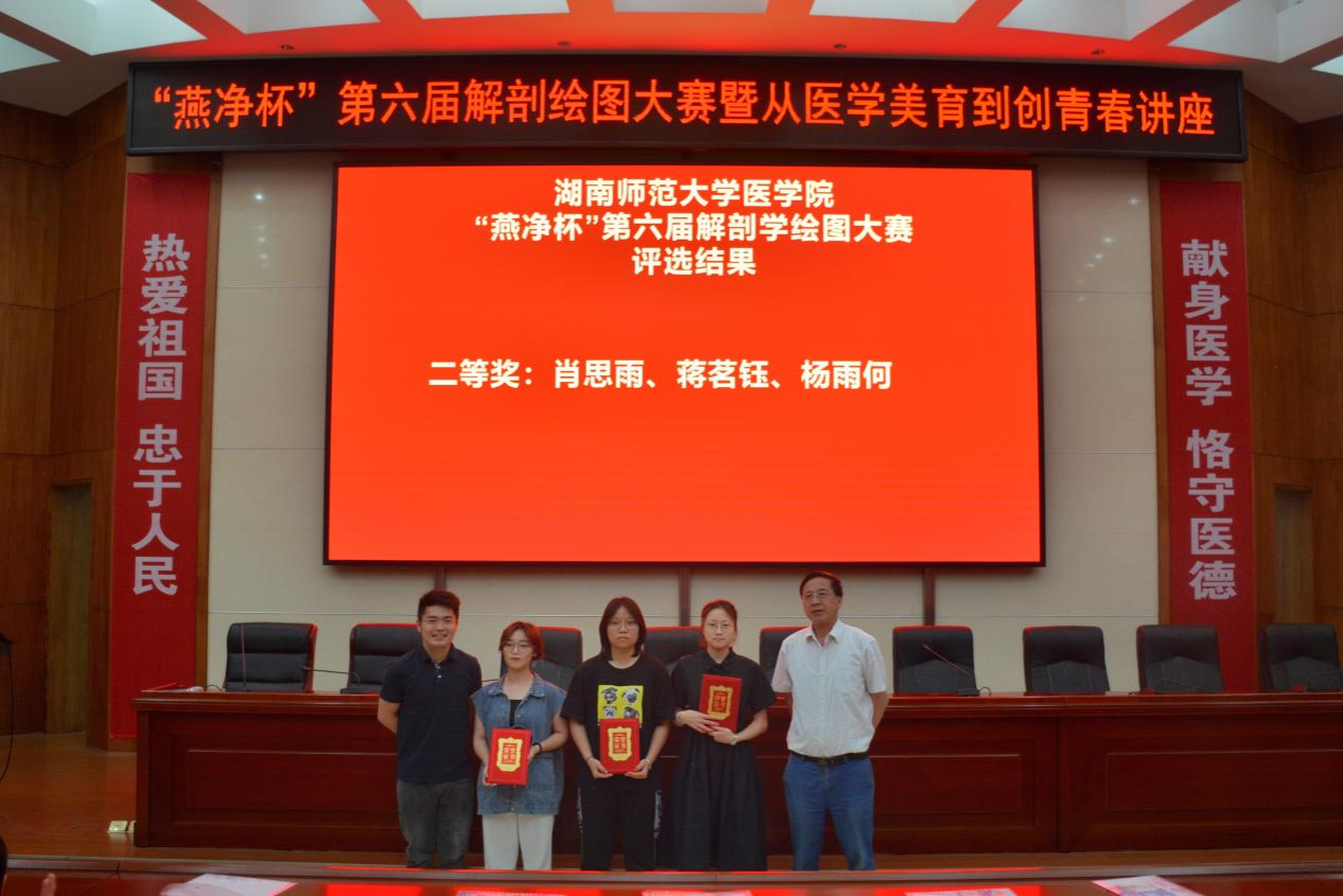 (通讯员 于淼 周春宇 王竟宜)为了进一步推动医学人文美育的发展,5月21日上午,医学院在仁医楼报告厅举办了“燕净杯”第六届解剖学绘图比赛暨《从医学美育到创青春》讲座。此次活动由医学院人体解剖学教研室主任简晓红主持,中南大学湘雅医学院形态学试验中心主任潘爱华,湖南中医药大学解剖教研室主任李新华,长沙燕净生物工程有限公司总经理言禹滔受邀出席活动,医学院院长何祖平、党委书记鄢朝晖、医学院副院长邓文艳参会。