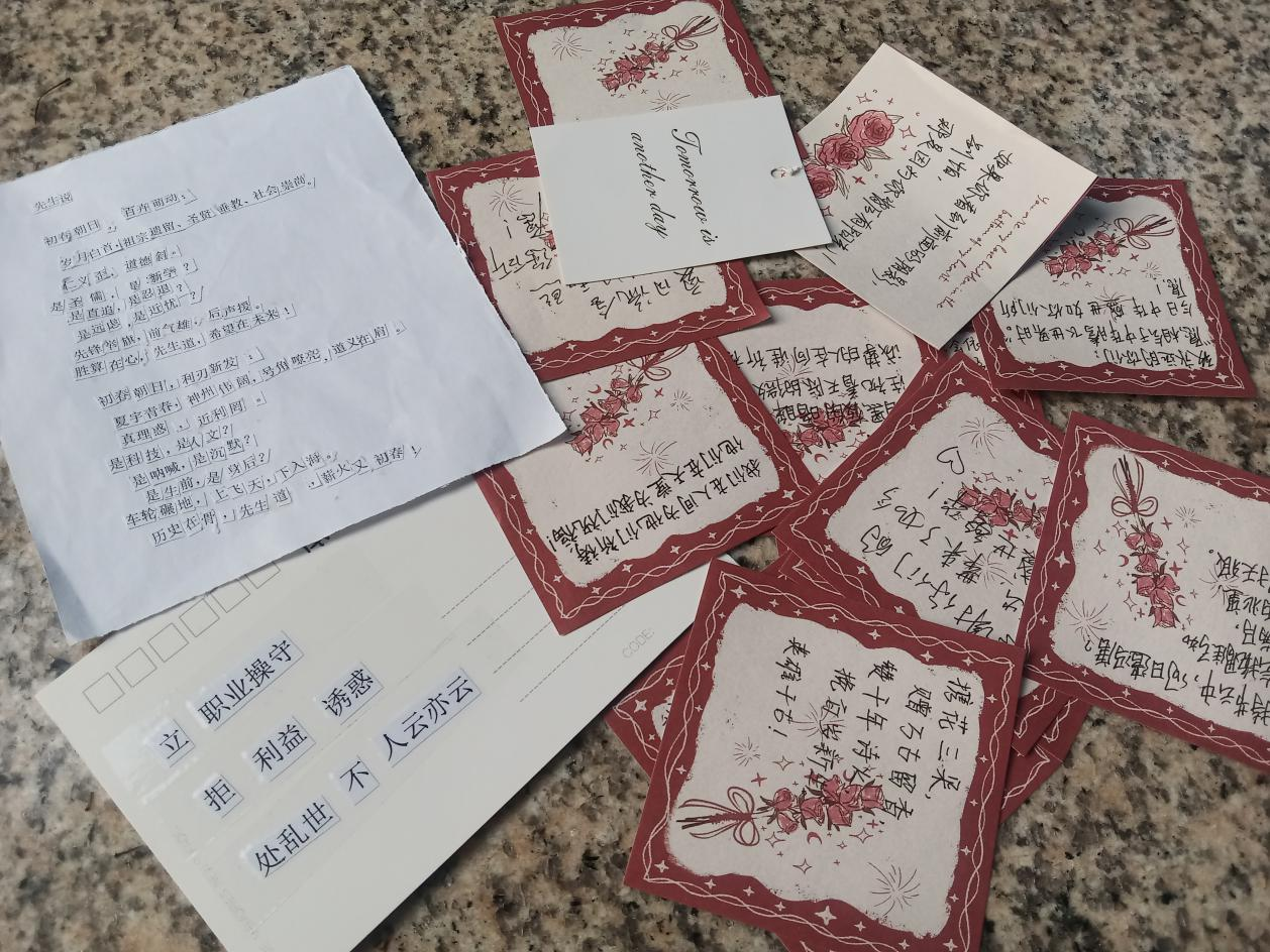 此次活动隶属于朝暾文学社“寻灯五四,举火人间”系列活动。活动期间,朝暾文学社理事在威廉希尔中文网站平台前坪设置纸箱,放置便签、笔和花束。参与活动的同学把心中对先烈的寄语写在便签中,将其投入纸箱后,可领取一支花。在此次活动里,花被赋予祝福和希望的意蕴。文学社提前准备好拼贴诗材料,同学们在活动群聊中自行下载打印材料,并制作拼贴诗作品,在繁复的诗歌意象里找到诗歌新的内涵。朝暾文学社工作人员组织收集整理便签与拼贴诗,评选出5份优秀拼贴诗作品奖励精美礼品,并将部分拼贴诗作品在威廉希尔中文网站平台进行展示。