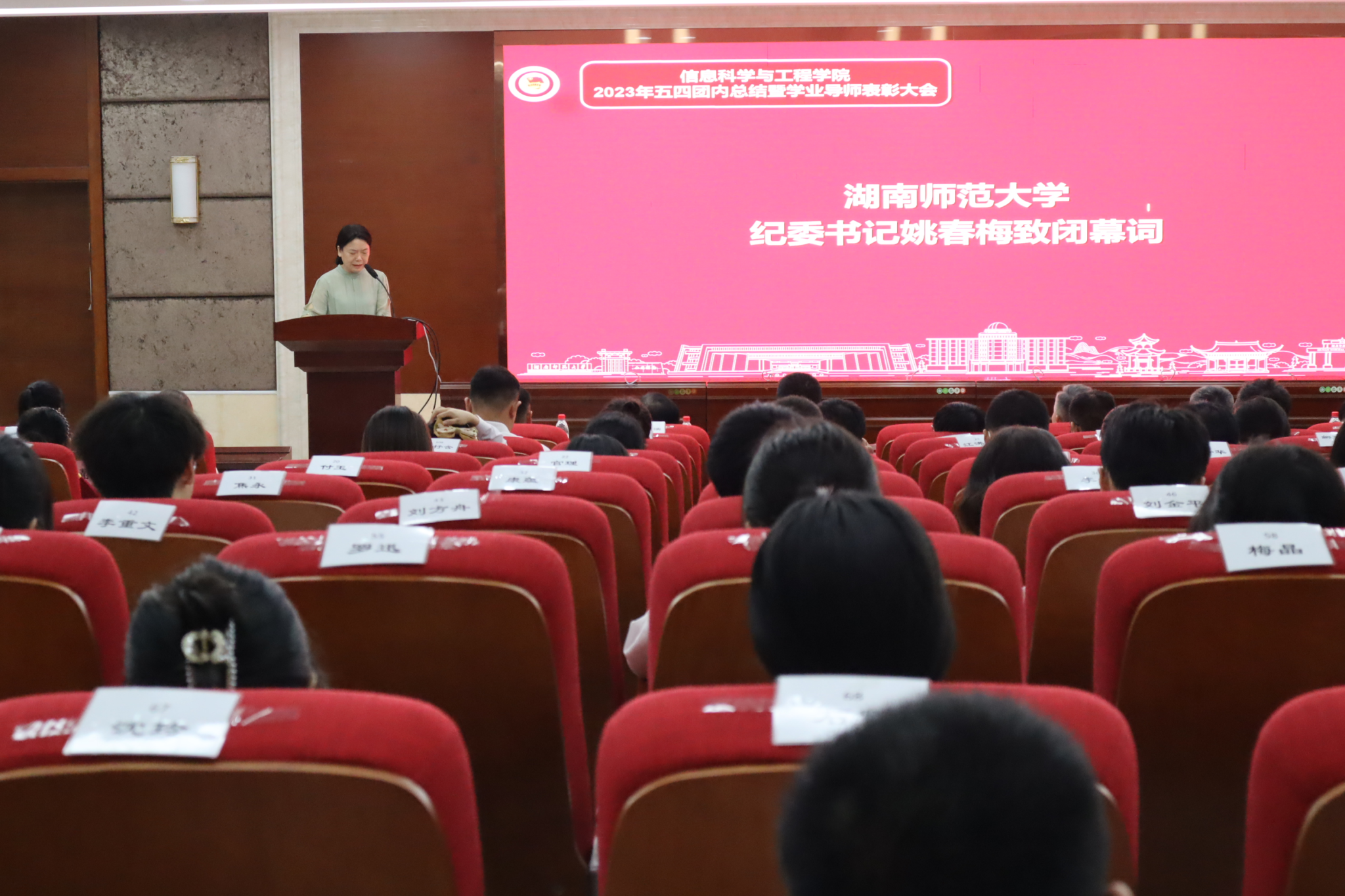 (通讯员 何嘉伦 刘欣丽)载誉扬帆,笃定奋进。为激励表彰优秀团员干部和学业导师,充分发挥先进典型引领作用,6月8日下午,信息科学与工程学院在中和楼342报告厅举行2022-2023年度“五四”团内总结暨学业导师表彰大会。校纪委书记姚春梅,校党委巡查组二组组长李学荣,信息院院长代建华,副院长唐文胜、刘相滨、余小莉,院党委副书记周劲松,学工办主任刘植及全体老师、获奖代表出席大会。本次大会由2021级辅导员于抒含主持。