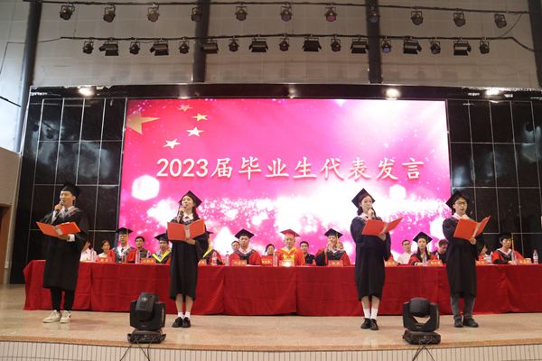 2023届毕业生代表李锐、侯文灿、冯译慧、韩金刚发言。他们对学院领导老师的支持与栽培、同窗亲友的陪伴与鼓励表示感谢,并结合个人经历,分享了自己在学院四年生活学习的感悟,表达了自己将不忘来路,砥砺前行,以实际行动践行威廉希尔中文网站平台“仁爱精勤”校训的决心。2023届毕业班辅导员朗诵《致敬青春》,为全体毕业生送上关于青春的祝福,激励他们迈步从头越,风起再扬帆。