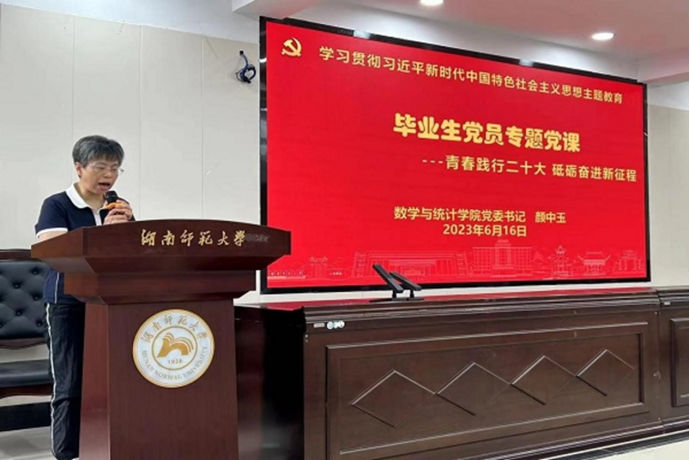 (通讯员 蒲佳莹 吕倚影 黄美绮)6月16日中午,数学与统计学院(以下简称“数统院”)于格物楼309报告厅开展“青春践行二十大,砥砺奋进新征程”毕业生党员主题党日活动。数统院党委书记颜中玉、副书记涂榉耀,院党委专职组织员覃志斌,党委委员、院组织人事秘书林虹,学工办主任李俐,研究生办公室主任孔璐璐,院团委书记肖惠卿出席此次活动,2019级全体毕业生党员参加活动。