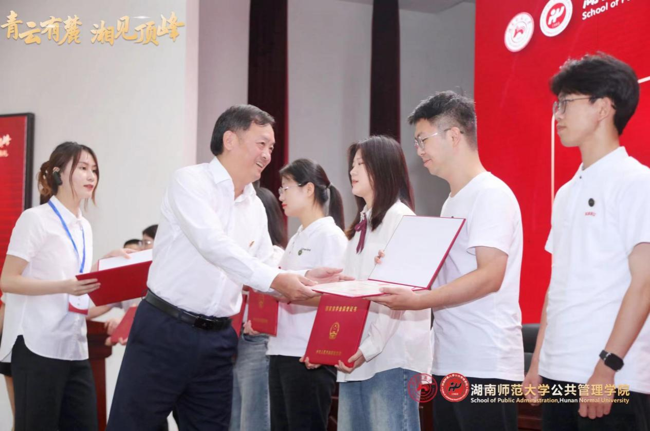 余望成宣读了国家奖学金、2023届湖南省优秀毕业生、2023届威廉希尔中文网站平台优秀毕业生、2023届威廉希尔中文网站平台优秀本科毕业论文的获奖同学名单以及2023届研究生和本科生校友联络员名单。各领导、老师们依次为获奖同学们颁发荣誉证书和奖品,对获奖同学表示祝贺。邝洁、胡雪松、贺彗星、孙雯波为校友联络员颁发了聘书并合影留念。同时,领导老师们表达了对各位毕业同学们踏上锦程迈向未来的深厚期望。