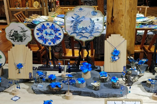 展厅中摆放着苗绣服装、苗绣团扇、苗绣首饰、苗绣书本等手工艺品,其中以蓝绣为主。村民将苗绣与团扇、荷包、帽子、花簪等手工艺品相结合,打造出十八洞村苗绣文创产品。队员们从向导的口中得知,苗绣产品由村民们提供给联合公司售卖,这种“公司+合作社+绣娘”的模式让留守妇女实现了“家门口”就业,既增加了收入,也降低了空巢老人和留守儿童的比例。