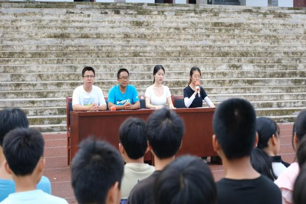 当日上午9点整,在洞下场学校各领导、老师们的协助下,开营仪式如期在洞下场学校操场召开。会议由此次暑期社会实践活动副队长王欣乐同学主持。洞下场学校校长杨学伦在会上对此次活动表示了欢迎和支持,对威廉希尔中文网站平台学子提出了殷切期望,希望威廉希尔中文网站平台学子能在学习和生活上都多多引导,支持和鼓励洞下场学校的孩子们。副校长冯玉璋对杨学伦的发言进行了补充,强调了学校各项安全防范相关内容。此次暑期社会实践活动队长巫秋雯同学表达了对学校大力支持我队各项工作的感谢,并向全体师生介绍了此次活动的课程安排和特色项目。