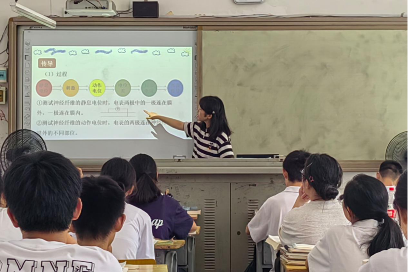 李悦进行生物专题课教学。她利用思维导图并结合物理学知识为同学们解释反射过程中局部电流的形成过程,以提问互动的方式带领学生们思考课本内容,帮助学生理解知识点含义,并对课堂内容进行总结。课后班主任罗春园对李悦提出建议,她鼓励李悦采取更多方式授课,通过板书和图画的方式让同学们更深入的了解问题,并学会适当放慢讲课速度,为同学们留下独自思考的时间。
