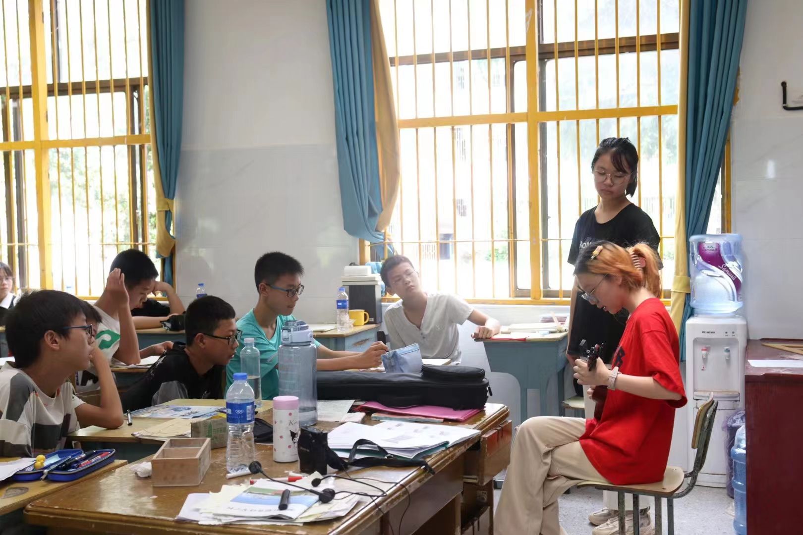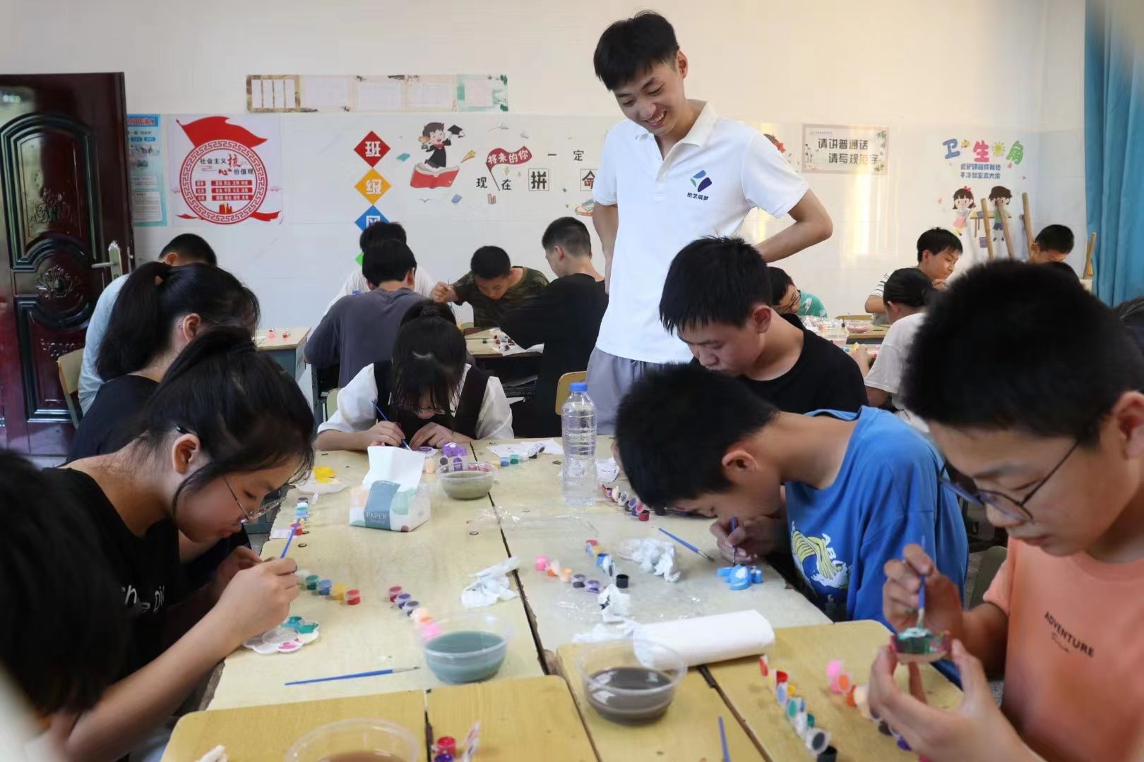 随后的音乐课也充分带动了学生的兴趣。音乐老师们借助尤克里里开展音乐教学,不仅对尤克里里做了简单的介绍,教了基本的谱子,还现场演示尤克里里的弹奏,并让学生自己试奏。紧接着,他们教学生们认识了简谱,符号,且分好了声部,让学生们跟唱。在跟唱过程中,学生们十分投入,热情回应,即使是有些害羞的男生也小声地跟着唱。在下午的美术课上也别开生面,每一位学生都积极参与。老师教授了一些基本的色彩概念,以及怎么给石膏上色。