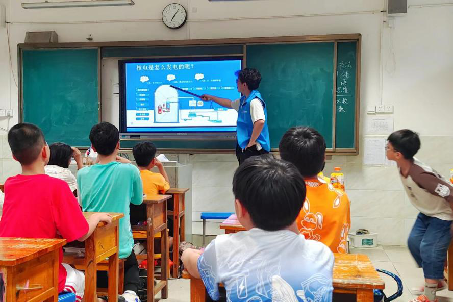 宣讲活动中,主讲人刘坤灵通过播放“一分钟了解核电站”的视频,帮助同学们形成了对核电站的初步认识。他从能源发展的维度设问,鼓励学生们大胆展开设想,从而引出产生电的几种方式:火力发电、水力发电、核能发电、风力发电。他结合PPT内容深入浅出地讲解了环保生电的方式---核生电。