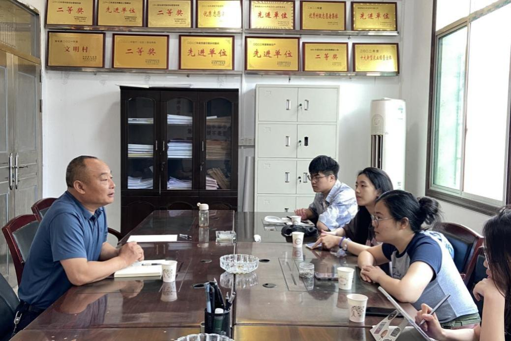 在走访调研前,成员们了解到梅城镇龙安村积极探索自主、自议、自筹、自建、自管的“五自”创建模式,大力推进乡村有效治理,是梅城镇建设“美丽屋场”的代表村庄。为进一步了解当地乡村治理措施,实践队成员们对龙安村村支部书记张开国进行采访。在访谈过程中,张开国向成员们讲述了龙安村村风村貌的发展变化,成员们从中了解到龙安村村委会重视红色文化建设并将其与乡村治理有机融合。此外,成员们参观了当地的工业园,进一步了解了龙安村合理利用区域资源助推产业发展的重要举措,认识到乡村产业发展为全面推动乡村振兴提供了强劲动能,深刻体会产业发展是乡村全面振兴的基础和关键。