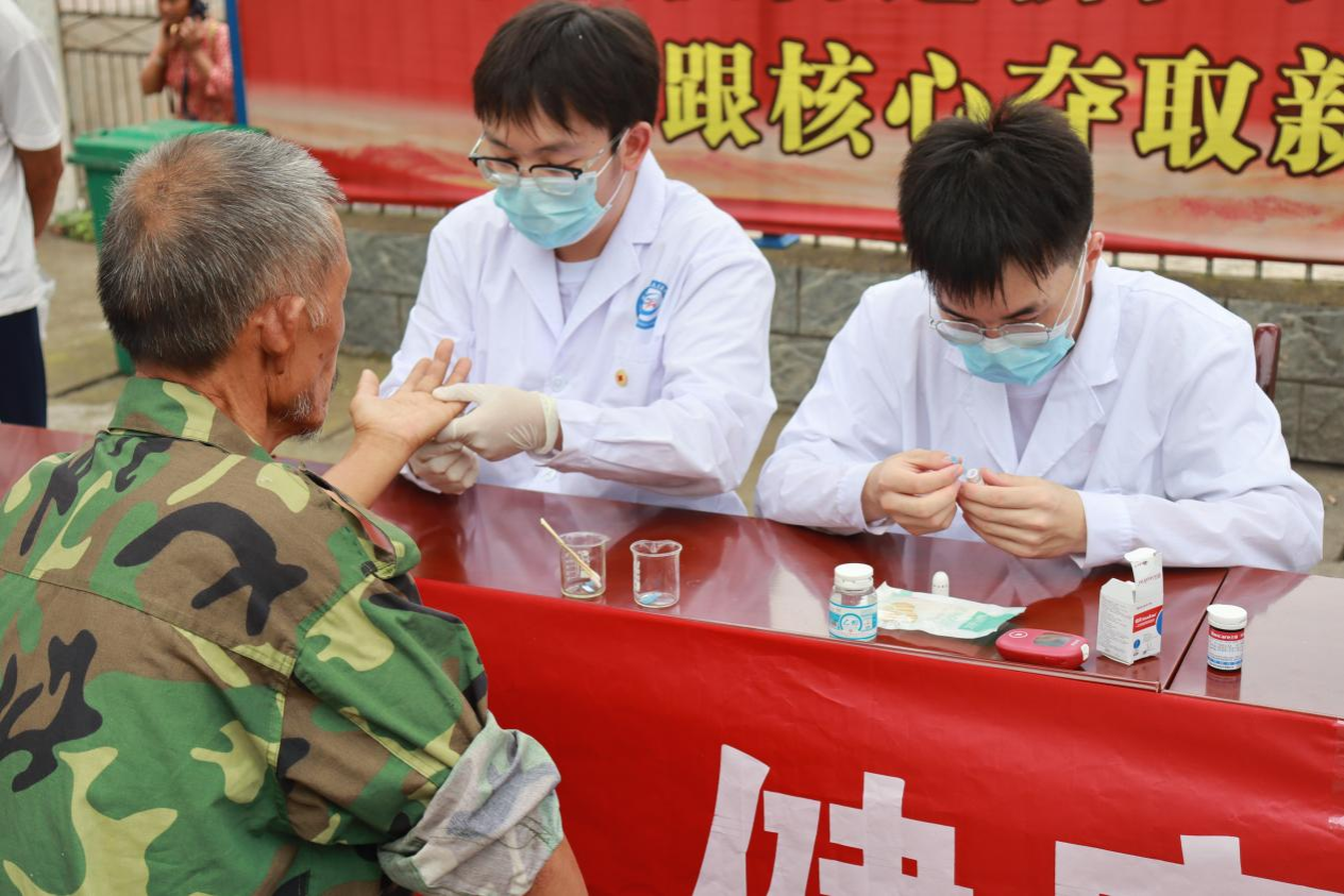 健康咨询组全体成员提前来到乡政府门口,进行咨询点的布置与仪器的准备。此次活动面向深溪口村全体村民,为其测量血压、血糖,提供健康咨询服务。活动中,志愿者们仔细询问前来咨询的村民的自身情况,并结合测量的实际结果,告诉他们测量的正常值,同时提出有针对性的改善建议。健康咨询组成员从科学的角度,与村民们分享各种仪器的使用方法和原理,并且凭借自身的医学知识针对咨询人员不同的身体健康状况,给出了不同的护理保健措施来帮助他们保持身体健康和指导他们如何进行合理的生活作息规划。
