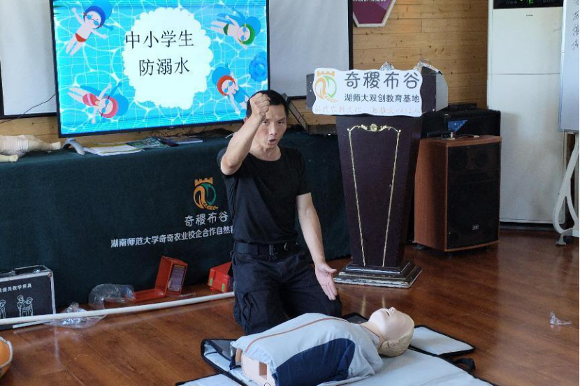 实践团特邀蓝天救援队金灿为奇稷布谷学校全体学生和来自珺雅中学四十名学生及其家长进行教学。金灿就常见防溺水教育、火灾类型、初期火灾扑救三个方面进行理论知识讲解。现场,他利用演示工具辅助讲解溺水事件的预防及相关急救知识,并进行胸外按压急救操作演示,帮助学生们掌握正确的急救方法。实践团成员带领学生们前往户外实践场所进行火灾模拟课程。金灿为大家示范防火面具使用方法,讲解干粉灭火器使用步骤与注意事项,并带领学生进行实践操作。8日至9日,实践团前往咸嘉湖邻里养老中心,与麓山国际实验学校共同开展敬老爱老主题红色论坛活动。实践团成员于养老中心活动大厅接待来自麓山国际实验学校的同学们并组织同学们于入口处签到,有秩序地进行才艺表演,包括红歌表演《我的中国心》以及诗歌朗诵《祖国啊,我亲爱的祖国》等。实践团组织学生分成两队分别前往老人们房间陪伴聊天以及健身室陪伴老人们做手指活动操。