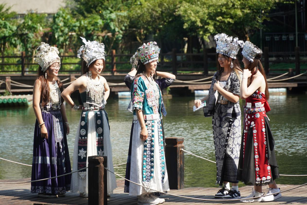 下午,大家精心化妆打扮,编头发做造型,换上侗族服饰,切身体验传统民族服饰,并在皇都侗族文化村拍照打卡留念。此外,实践团成员在演出厅欣赏了侗歌、侗戏等精彩表演,与演出人员一起跳了“多耶舞”,体验侗族表演文化。晚上,大家品尝了侗族招待贵客的合拢宴,体验当地的饮食文化。