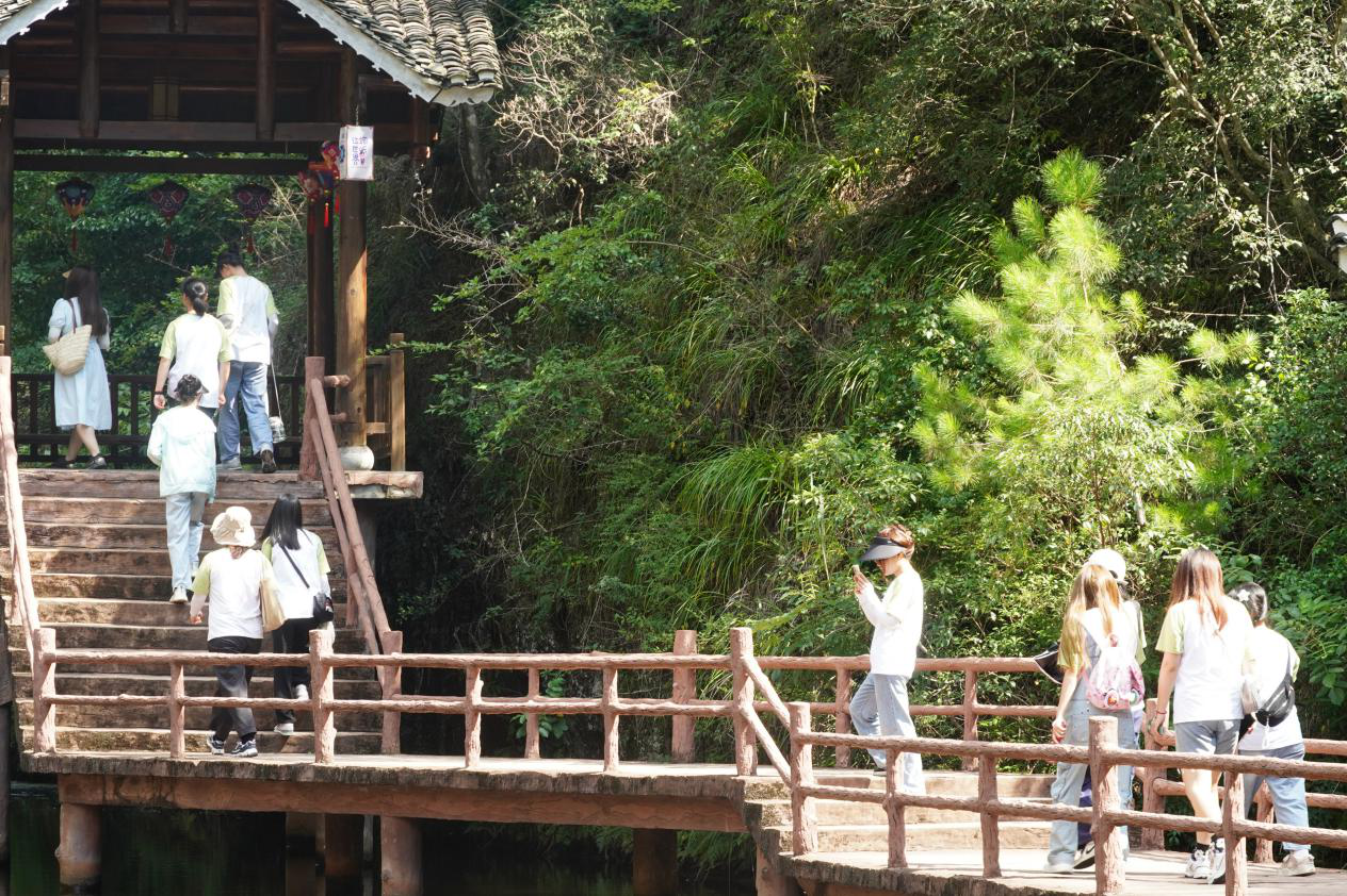 上午,实践团成员乘坐公交车抵达万佛山下。经过简单的准备后,实践团成员开启了爬山之旅。万佛山中有绵延一百多公里的丹霞峰林地貌,这里自然植被茂盛,空气清新,景区内还开通了“万佛山悬空栈道”。实践团成员在玻璃栈道中行走,不仅观赏了山中美景,还挑战了自己的胆量。在攀爬的过程中,大家互相鼓励、互相扶持,共同克服困难,加强了彼此之间的默契和团队合作能力。