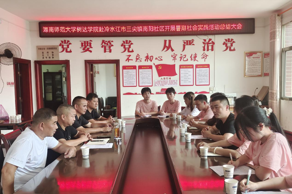 (通讯员 罗娜)7月10日上午,树达学院经管系、理工系“筑乡梦”暑期社会实践团在湖南省冷水江市三尖镇南阳社区会议室召开暑期社会实践活动总结大会。南阳社区党总支书记周洪长、南阳社区副主任邓水丹、南阳社区会计阳吉龙、南阳社区综治专干邓国瑶、树达学院理工系团总支书记朱继来、实践团指导老师陈蓉出席此次会议。