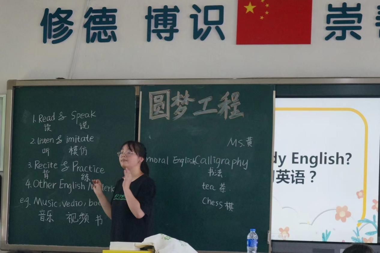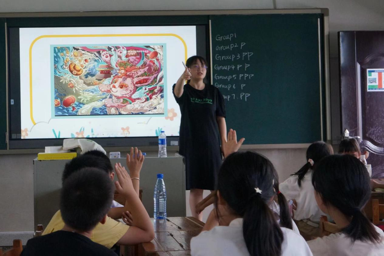 课堂上,黄嘉为学生们播放了有关春节的英文短片,极大激发了学生们对英语学习的兴趣,在给孩子们教授英语知识的同时,也向学生们深入介绍了中国的传统春节,弘扬了中国传统文化。课堂采取问答奖励的创新机制,学生们争先与老师互动,课堂活跃度与参与度大大提高。针对当前乡村英语教育落后、乡村孩子英语学习困难的局面,黄嘉给学生们分享了一系列学习英语的方法,介绍了各种有效整合英语学习资源的路径,鼓励孩子们广泛地涉猎各种英语材料,努力培养自身的跨文化素养,不仅限于英语的书面学习。