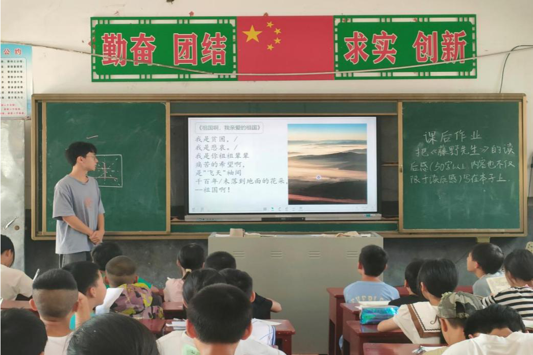 为更好地开展此次活动,实践团成员集中进行讨论,明确推广普通话活动的方案。教学组成员彭湘黔在小升初班开展普通话课程,通过字词教学、诗歌朗读、绕口令等教学活动,带领学生们学习并使用普通话,提高他们的语言表达能力和自信心。在不断练习中,学生们能够清晰流利地朗读字词和诗歌。