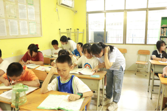在书苑的作业辅导课程中,实践团成员密切关注学生,以便在他们有疑问时能立即解答疑惑。在一次次俯身答疑中,实践团成员了解到英语是学生们较为薄弱的一科,而英语不好会拉低总体成绩。在乡村文化振兴的道路上,教育是极为重要的一环。在较为贫困的地区,英语教学团队的稀缺仍是一个不可忽视的问题。如何在这些贫困地区开展高效的英语教学工作,是寻找乡村振兴路径的突破点。