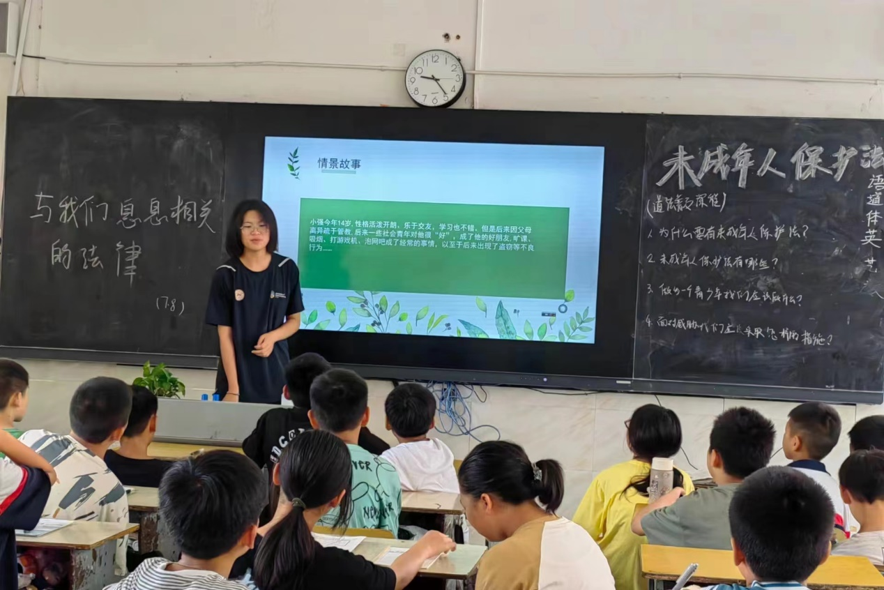 (通讯员 刘珺霓 龙立文 段楚楚),7月11日上午,“问源渠江”支教队于安化县渠江学校开展“与我们息息相关的法律”普法课堂。黄雨欣担任主讲人,渠江学校五年级全体学生参与学习。