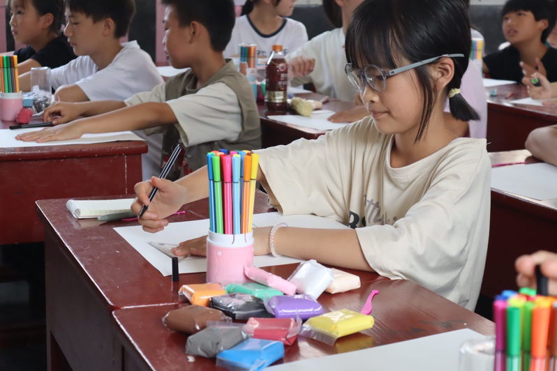 音乐赏析课上,学生们在实践团成员的带领下,认真学习乐理知识,积极参与节拍互动游戏,大胆走上讲台进行歌曲演唱。从最初的小心翼翼不敢发声到之后的歌声嘹亮,学生们逐渐建立起自信,尽情感受音乐的魅力。在手工黏土特色课程中,学生们积极投入创作,发挥想象力和创造力,以绘画与黏土相结合的方式,制作出拉面、花盆、甜点等各种创意作品,课堂上气氛活跃,学生兴趣浓厚。