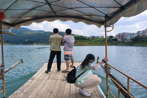 下午,实践团队所有成员前往湄江镇,湄江镇地处湘中腹地的涟源市西北部,总面积128平方公里,2009年被批准为国家地质公园,拥有丰富的旅游资源。实践队成员来到湄江边对湄江水质、周边村庄耕地利用、农业污染与生态治理状况开展调研活动。湄江是湘江最大的一级支流,发源于贵州省遵义市。湄江沿岸土地肥沃,耕地连片集中,是主要的产粮区。团队在三天的时间里对湄江镇苏家村、珍珠村、仙女峰村等村庄开展调研活动。在完成村庄调研活动之后,团队来到了湄江。多彩湄江,风光无限,成员搭乘当地观光船在湄江江面游览。在蓝天白云下,绿色青山间,队员们呼吸着清新的空气,享受着绝美的自然风光,泛舟游于湄江上。