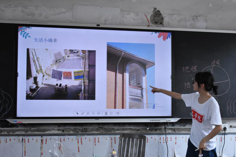 宣传组成员蒙亚琪从摄影历史、摄影技巧和摄影实践三个方面展开教学。在课堂上,蒙亚琪展示了摄影图片并让学生们分析直观感受,随后详细讲述了摄影的构图技巧。讲到二次构图时,部分学生表示不理解,蒙亚琪指出二次构图就是要突出摄影者想要表达的重点,利于帮助学生们学习和掌握这一技法。下课后,学生们利用实践团带来的摄影设备在教室、操场等场地进行实践,蒙亚琪结合自身的摄影经历指导学生们按下快门,记录所见,活动氛围融洽,师生互动感十足。