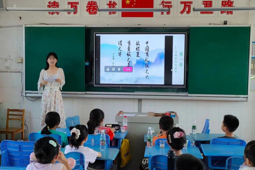 “非遗进校园,汉韵连古今”文化课堂在二年级和四年级开展,由老师讲解汉服礼仪文化和形制特点、学生制作手工汉服、老师验收成果三部分组成。孙亚茹为学生讲解汉服礼仪文化,带领学生感受不同朝代汉服礼仪的演变,强调汉服文化反映的是儒教礼典服制的文化总和。曹惊姿从流行花纹、衣服颜色两方面向学生介绍不同时期汉服的形制特点,探讨汉服形制演变背后的历史文化原因,带领学生深入思考并感受中华传统文化之美。学生模拟汉服打版、裁剪和上色等工艺,根据汉服形制特点制作汉服手工作品并展示。