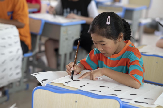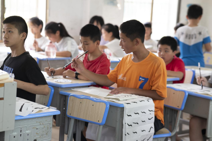 (通讯员 谭竞 陈俊宇)近年来,越来越多的学生对于书法艺术表达出浓厚的兴趣和热爱。为满足学生们的需求,进一步促进同学们对传统文化的认同,7月13日,美术学院“同心绘梦”队成员蒋雅婕、丁俊龙在张家塞乡胜利小学开展“墨香悠远,笔随心动”书法教学课程。