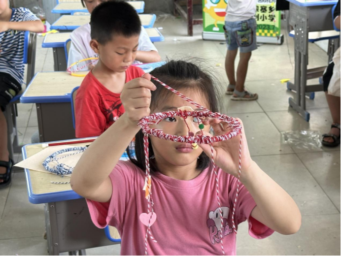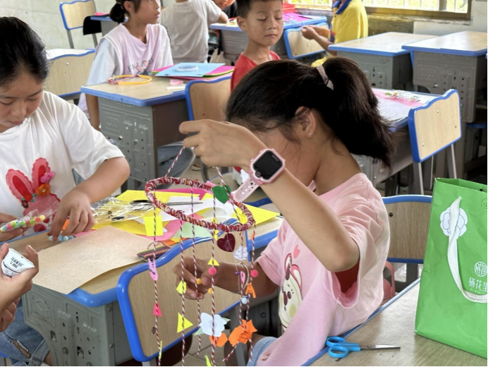 制作风铃是一项有趣的手工艺活动,可以让同学们专注于手工过程,从日常学习生活的压力中解脱出来。通过制作过程营造宁静平和的氛围,享受手指触摸材料和细节的感觉,放松他们的身心。此外,美术学院“同心绘梦”队将继续开展特色手工艺课程,为乡村美育贡献一份自己的力量。