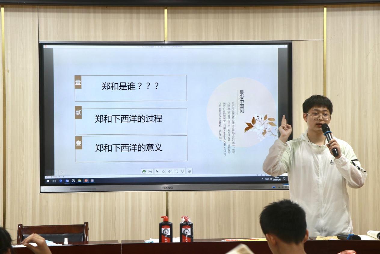 李正以人物为引,分别从中国的“三宝太监”郑和与西方的马可波罗的视角展开叙述,为同学们讲述中外文化交流的悠久历史、古丝绸之路开创的艰难历程及其深远意义,并用中国助力马尔代夫实现“桥梁梦”、坦赞铁路、中欧班列等具体实例为同学们简单描绘了当代“一带一路”的宏大蓝图,引导同学们将新老丝绸之路进行比较,从中感悟我国近代以来经济发展之迅速以及“一带一路”合作倡议的伟大之处。