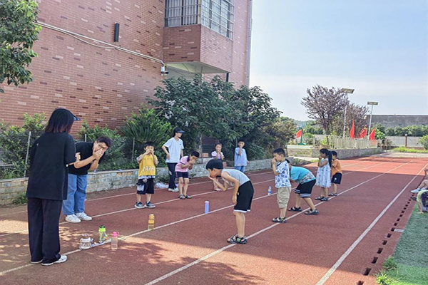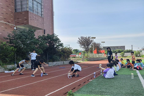 “三,二,一,开始跑!”教学组队员在跑道上摆放套圈和瓶子,为参加往返跑比赛的小朋友们喊口令。比赛以套圈为起点,参赛者须踏进前两个套圈出发,拿到作为中点的瓶子之后返回套圈处,速度快且无失误者获胜。小朋友们积极参与,没轮到比赛的也在跑道之外加油鼓劲。比赛有第一名自然也有最后一名,教学组成员安慰跑得较慢的小朋友,借此机会普及了“比赛重在参与”“坚持完成”的体育精神。