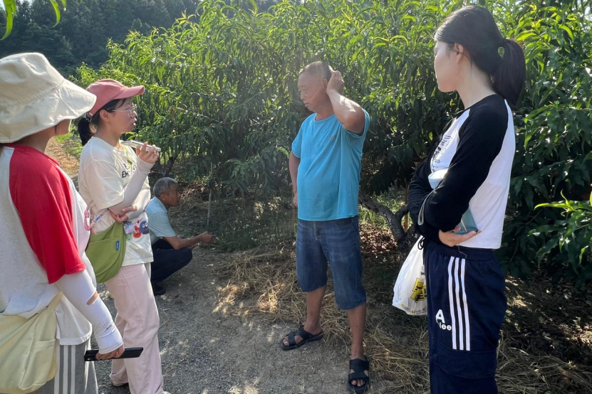 实践团调研组成员采访炎陵县立体农业种植先锋黄松贵。黄松贵表示最初只种植黄桃和奈李,为了充分利用空间,提高产量并节约土地,他采用创新性种植,购买了水苔、魔芋种子进行立体种植。上面种植黄桃,下面种植魔芋或水苔,不仅能够便于管理,还可以缓解残留化肥、农药等对土壤环境、水环境所带来的的压力。